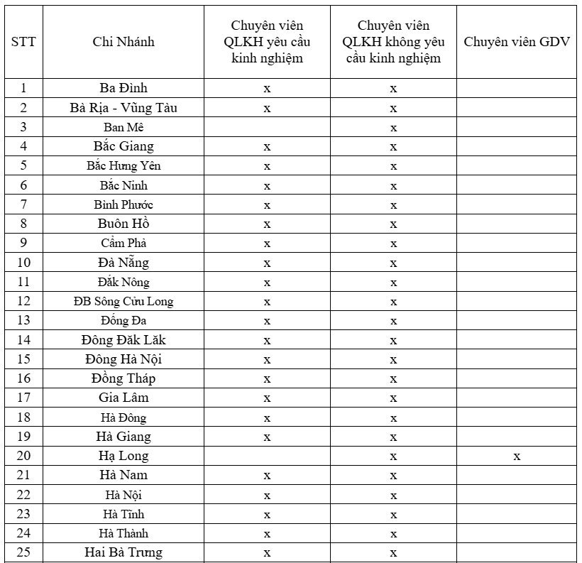 - Mỗi ứng viên chỉ nộp hồ sơ cho 01 vị trí tại 01 chi nhánh. Trường hợp ứng viên cố tình nộp cùng lúc tại các chi nhánh hoặc vị trí khác nhau, BIDV sẽ chủ động loại bỏ hồ sơ để đảm bảo 01 ứng viên chỉ thi tuyển 01 vị trí tại 01 chi nhánh.