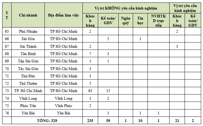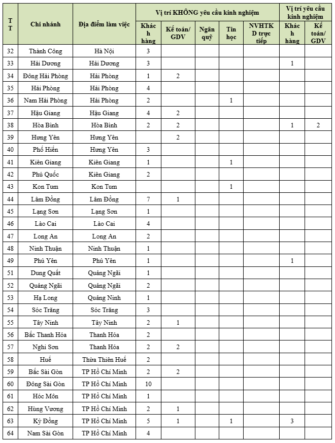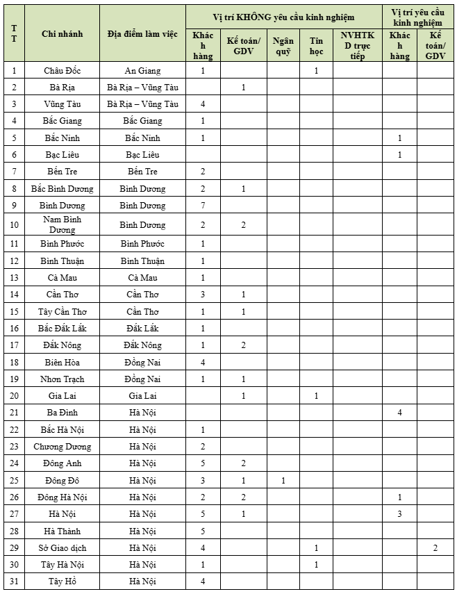 I. Chỉ tiêu tuyển dụng của các chi nhánh